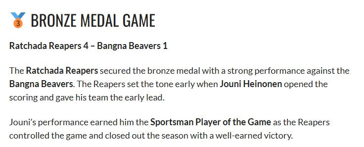 The Reapers had rather disappointing results in the playoffs but did take the Bronze medal (3rd place):
